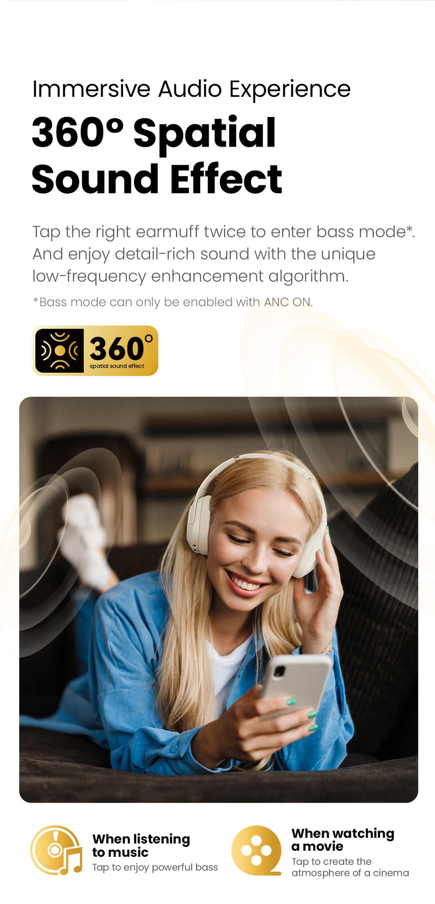 Tap the right earmuff twice to enter bass mode. And enjoy detail-rich sound with the unique low-frequency enhancement algorithm.