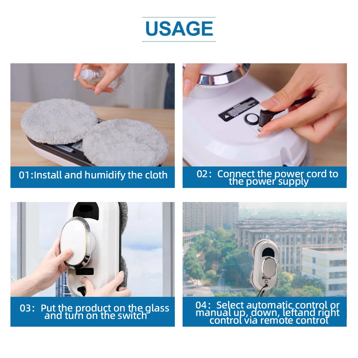 1. Wait 20 seconds after starting up until the blue light stop flashing,Then start working. Because the robot need 20sec to detect the glass plane.