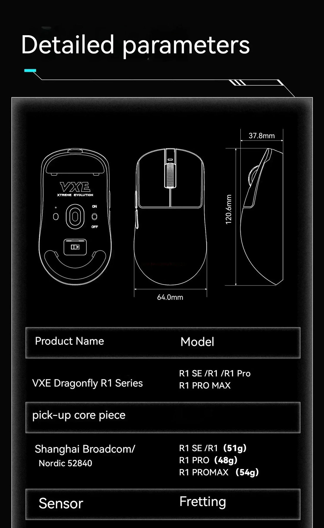Weight: R1 SE/R1 (51g)/R1 PRO (48g)/R1 PROMAX (54g)